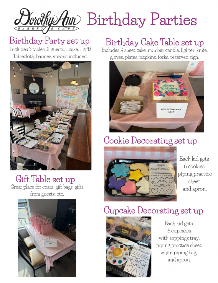 All materials required for decorating are provided by Dorothy Ann Bakery. This includes: tablecloth, disposable apron, piping bags, bakery treats, toppings, and boxes for each birthday guest to take their decorated creations home with them.