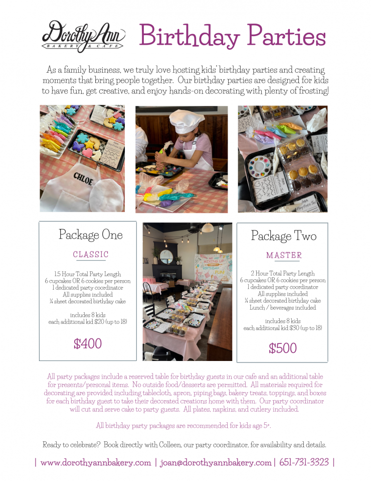Joan@dorothyannbakery.com is the best email to get in touch with our team. Please include: name, phone #, hopeful date(s) of party, and style of decorating.
